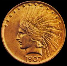 Estas monedas de 10 dólares de 1907 y comienzos de 1908 tampoco dicen IN GOD WE TRUST. Esta frase fue añadida recién en 1908 en la cara del águila. Dos estrellas adicionales fueron añadidas al canto en 1912.  Una vez más, el público las recibió con bastantes críticas.  Los ciudadanos lamentaban que La Libertad usara un tocado indio en lugar del gorro frigio tradicional.  El mismo presidente Roosvelt debió rebatirlo en estos términos: “Es un mero sinsentido. No existe motivo alguno para que un indio siempre sea representado por un tocado de plumas y la Libertad por un gorro frigio. El indio, a su manera, simboliza la libertad. ¿Por qué la cara de la Libertad aparece siempre bajo formas convencionales? La cabeza dibujada por Saint-Gaudens es la cabeza de la Libertad, de la Libertad norteamericana, y le queda perfectamente bien usar un hermoso tocado, que es pura y típicamente norteamericano.”